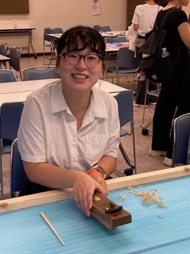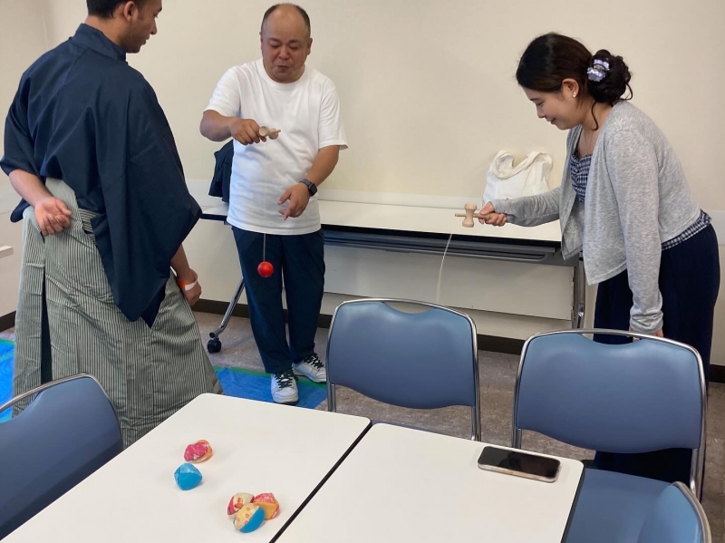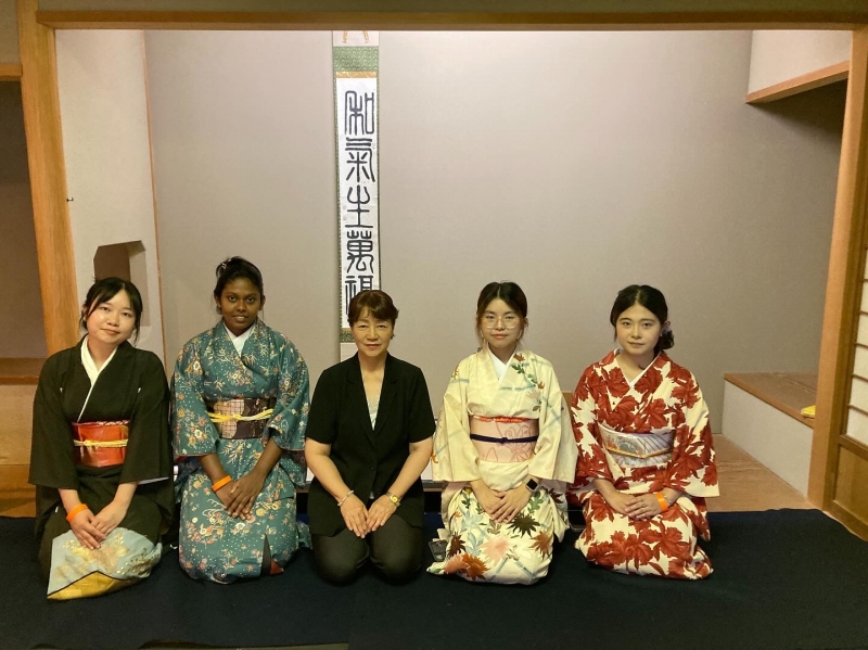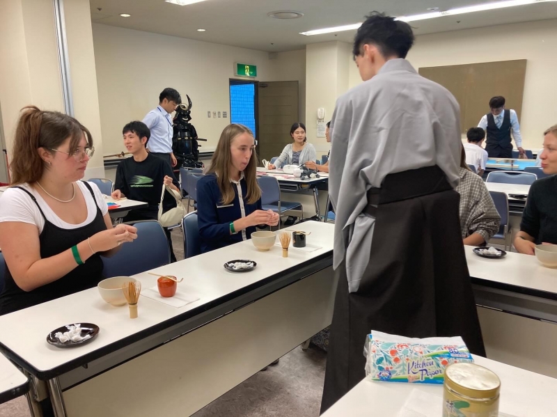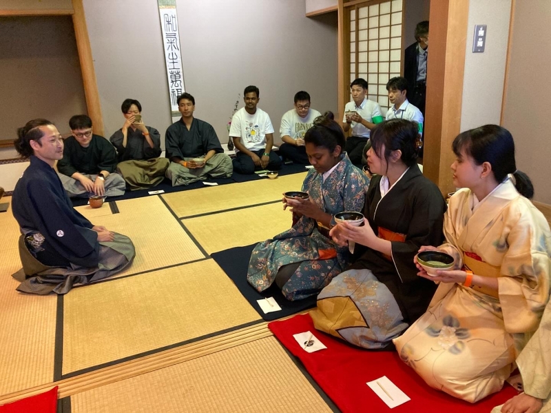 留学生が着物を着て、茶道を体験した後箸づくり、けん玉、折り紙、茶道の仕方等日本の文化を体験した。